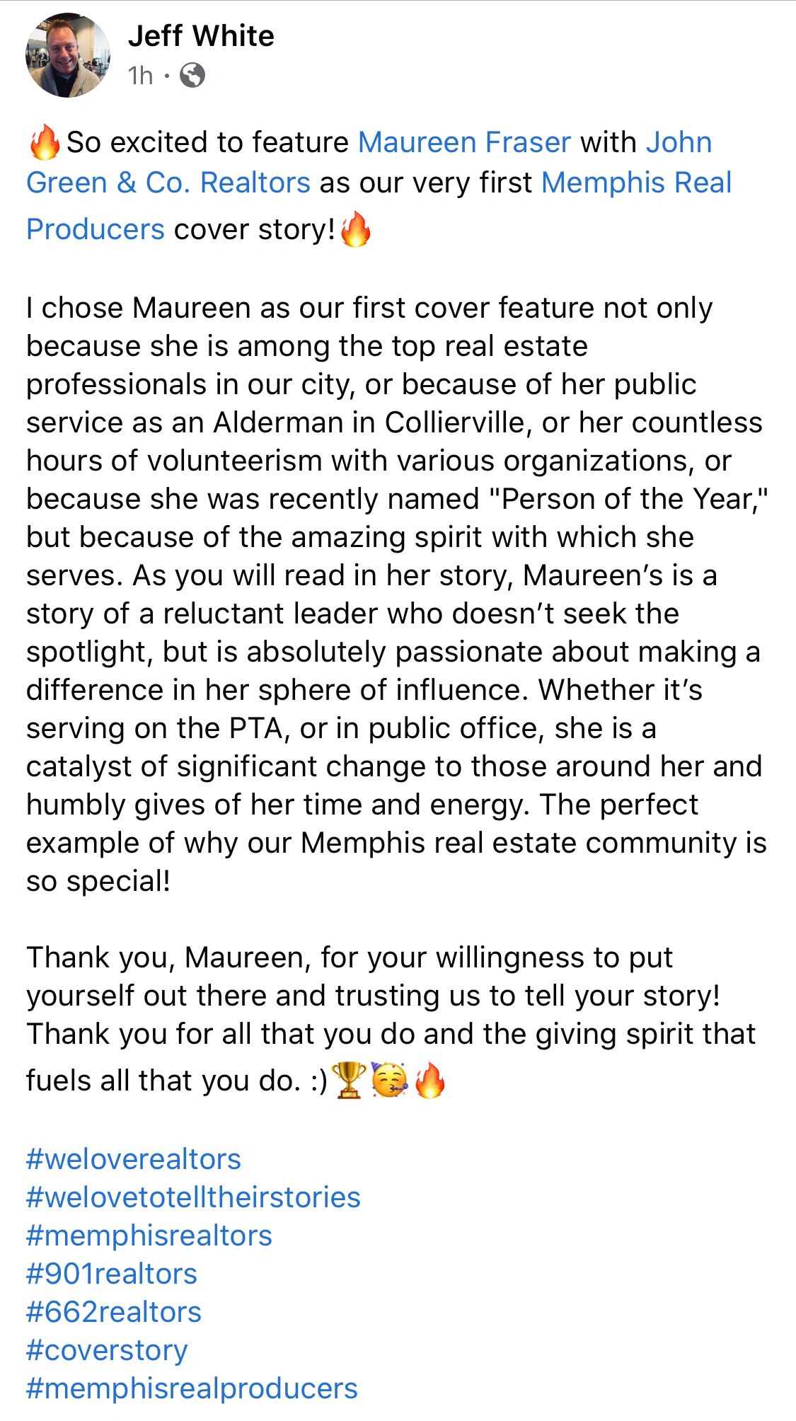 Maureen Fraser used to be the last to sign up for things. Sometimes her reluctance came from the apprehension of commitment, but mostly she waited to volunteer for what no one else wanted to do. Now she is being honored as Collierville’s “Person of the Year.” Over the past twelve months, she has done a total of $33 million in volume sales.